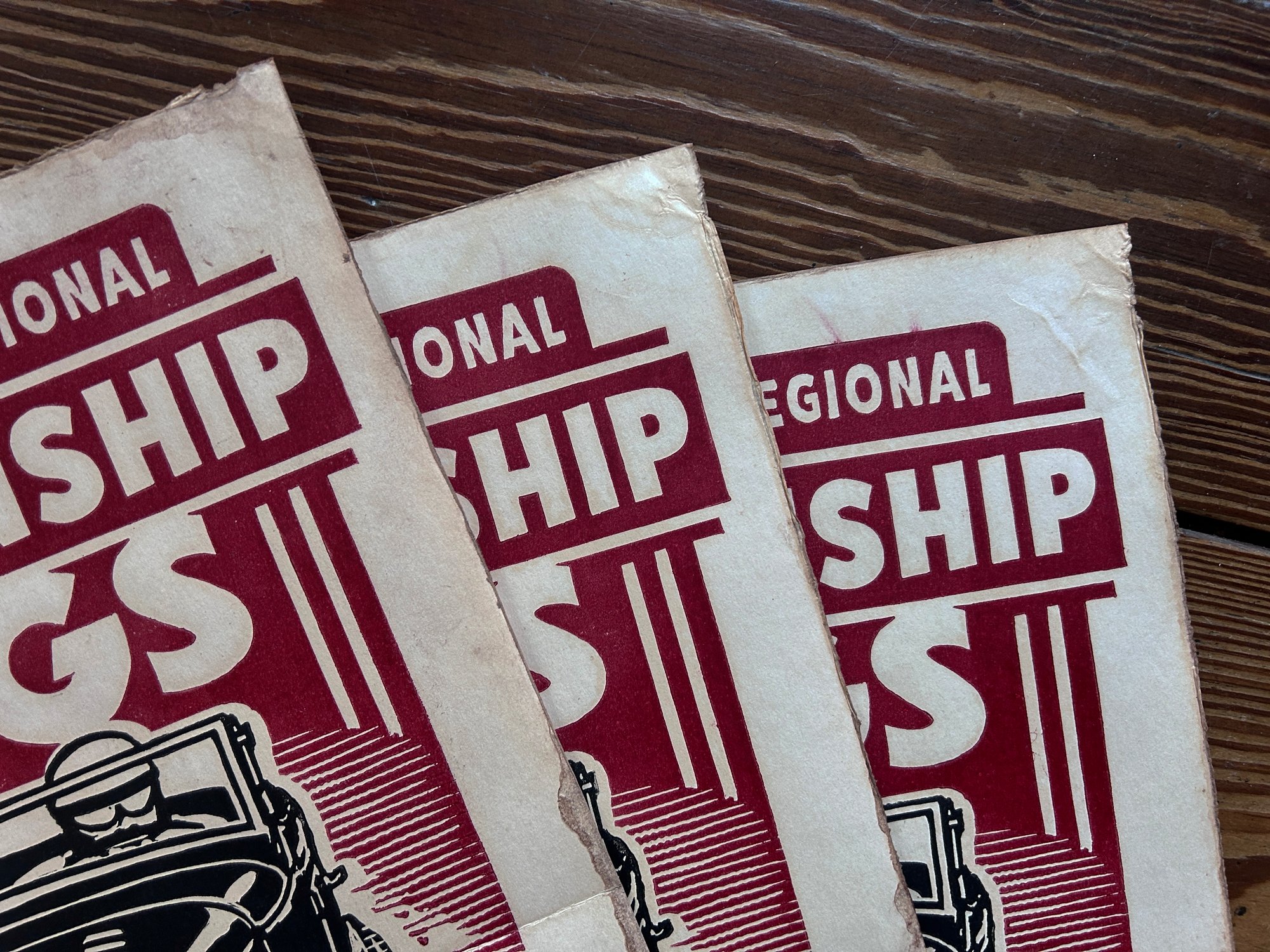 After being printed and dried, each print has been artificially yellowed, worn, stained, and aged (Fold marks, stains, edge/corner wear).