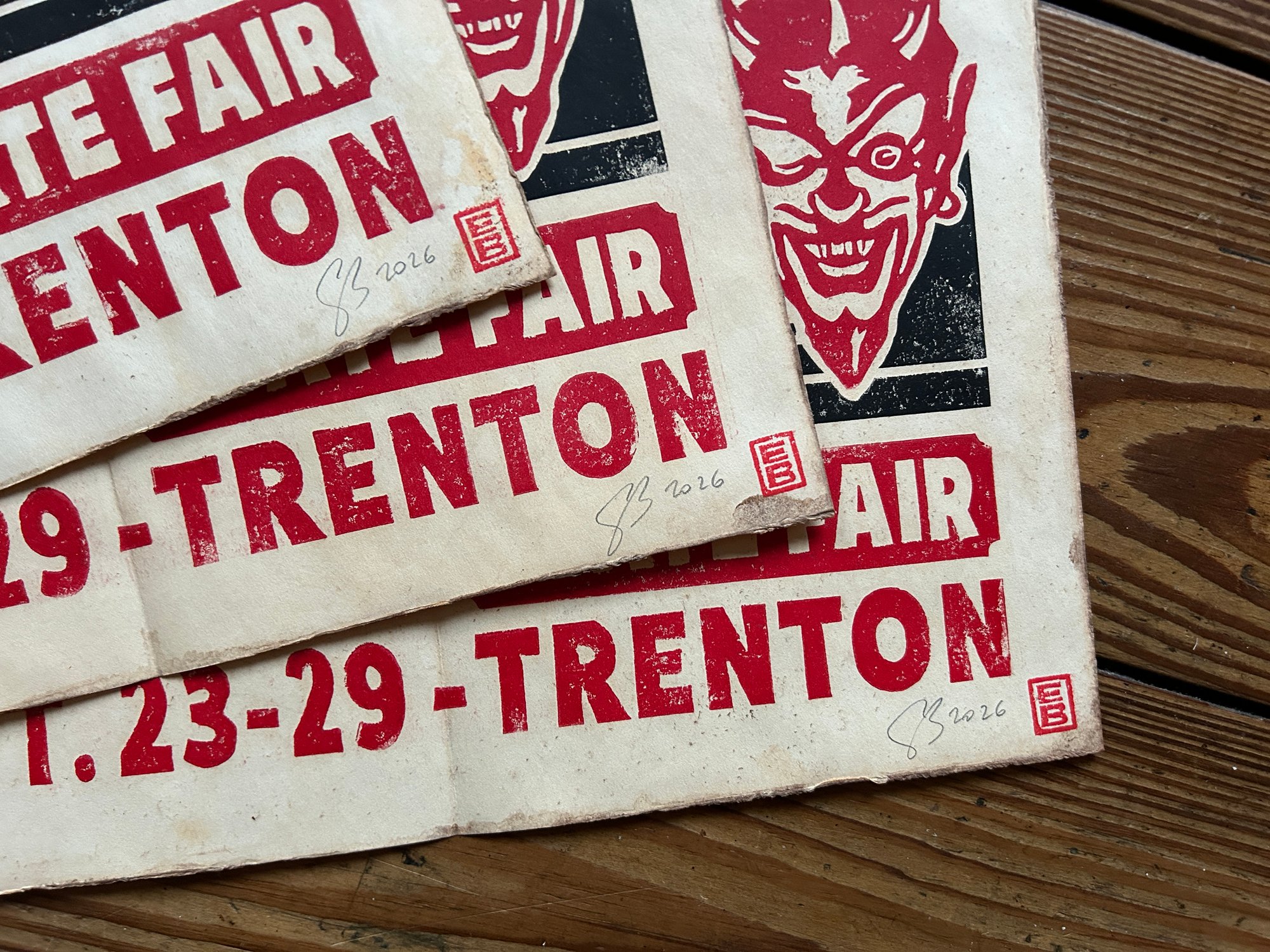 Two colors print using 2 linoleum blocks : Red and black inks (Speedball oil based inks) on Gerstaecker 125gsm white paper.